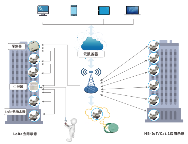 在需要實時傳輸或NB-IoT網絡覆蓋較差的情況下,可使用LoRa傳輸方式,表計通過LoRa方式將數據傳輸至數據采集器,再匯總至云平臺。